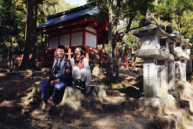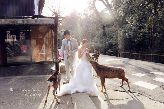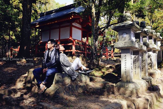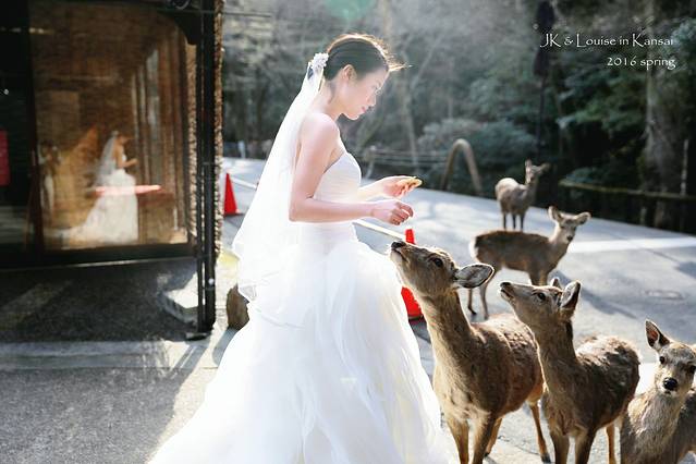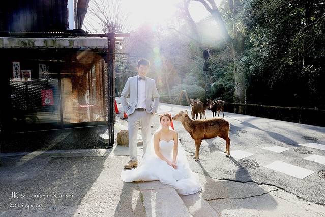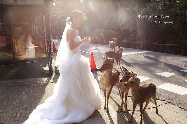 第二天六点左右,我们就在昏暗寒冷的天气里爬起来了。今天要照第二次婚纱照,穿戴好拿上摄影器材出门时天已经亮了。这个时间的奈良几乎没人,非常适合我们撒泼拍照。