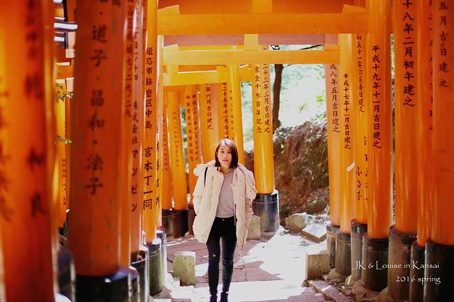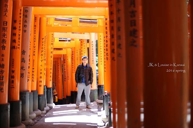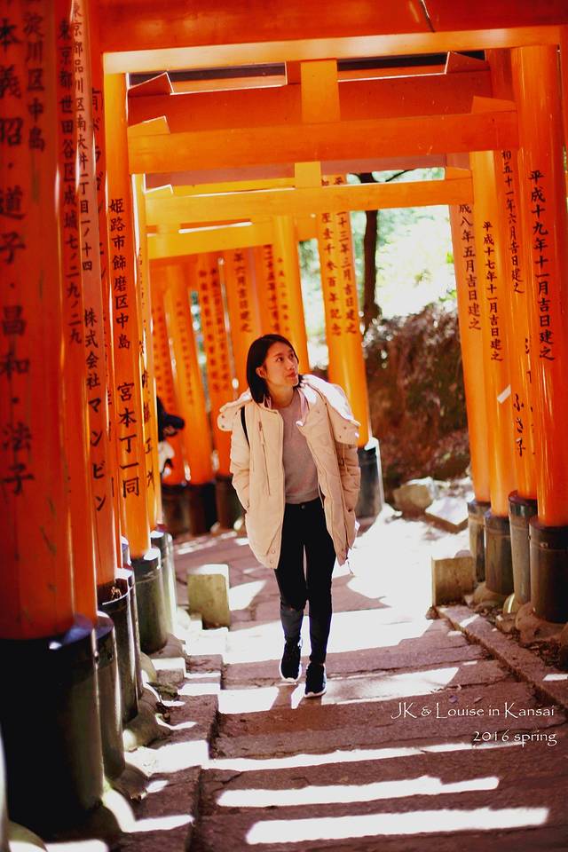 爬到半山腰才能好好拍拍千本鸟居。自江户时起,信徒来来此许愿达成后,都会献立一座鸟居,时间久了,就形成现在这个千本鸟居的壮观场面了。鸟居从山下一直绵延到山顶,想要彻底爬到山顶还是要废点体力,得花上两三个小时,日本人自己也很少有人爬上去(这也是机场日本小哥说的),加上我们前一天通宵没这么休息,所以就爬到半山腰照了几张照片也就下山了。