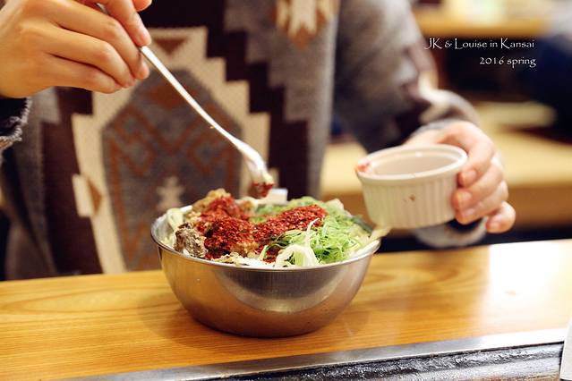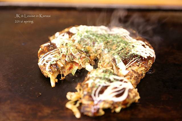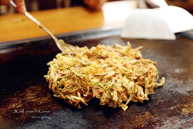 来到大阪怎么能不试试大阪烧呢。新世界美食街上几乎开满了串烧店和大阪烧店,香味弥漫了整条街道。我们找到一家规模比较大的大阪烧店来解决中午饭。一般大阪烧店桌上都会有一块铁板让你自己煎,当然,如果自己搞不定也可以请服务生帮忙煎。但我怎么能错过这种又好吃又好玩的美食呢!我们点了一份店面推荐的大阪烧和一些串烧,不想吃太饱,留着肚子可以吃点其他东西。大阪烧端上来就是这么一碗食材,我们要自己把食材混合好,然后整完倒进铁板上,整形成圆饼状,双面煎,然后挤上酱汁就大功告成了!(PS.放辣椒这种事情我可是从来不会含糊的!)