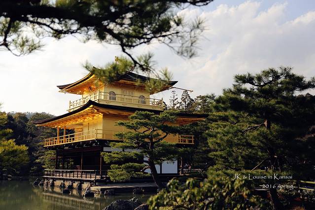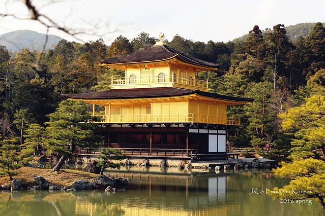 今天的第一站打算去看看金阁寺,在京都站的巴士站就有很多巴士能到那里,巴士统一价230日元一人。金阁寺曾经是一座将军府,而将军去世后被改成禅寺,取名为鹿苑寺,因为外观贴满耀眼的金箔而得名金阁寺。