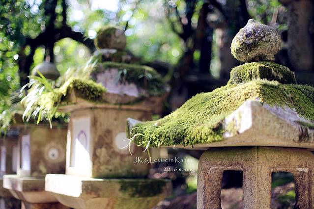 奈良其实也是一座古城,奈良森林的风格一下子让我想起了宫崎骏的动画片《幽灵公主》里面的场景,春日大社后面的周围全是茂密的古树,周围附着的青苔将这里的建筑和环境点缀得古老而神秘。越往深处里走,人越少,透过树叶洒在青苔上的斑驳光影、微风吹拂树林的沙沙声、偶尔一两声鸟鸣、已经在树林里一闪而过的小鹿,这种静谧的气氛让人晃神,仿佛自己就处在原始的大森林里。我们一路往山上爬,一路大口大口呼吸着森林里的空气,负离子已经穿过我每一寸皮肤。