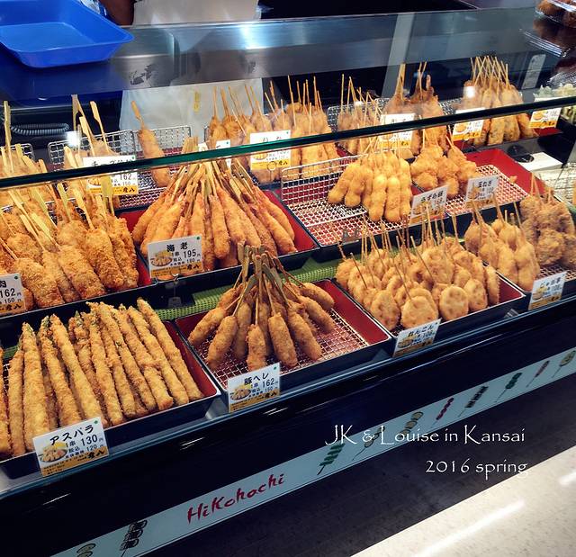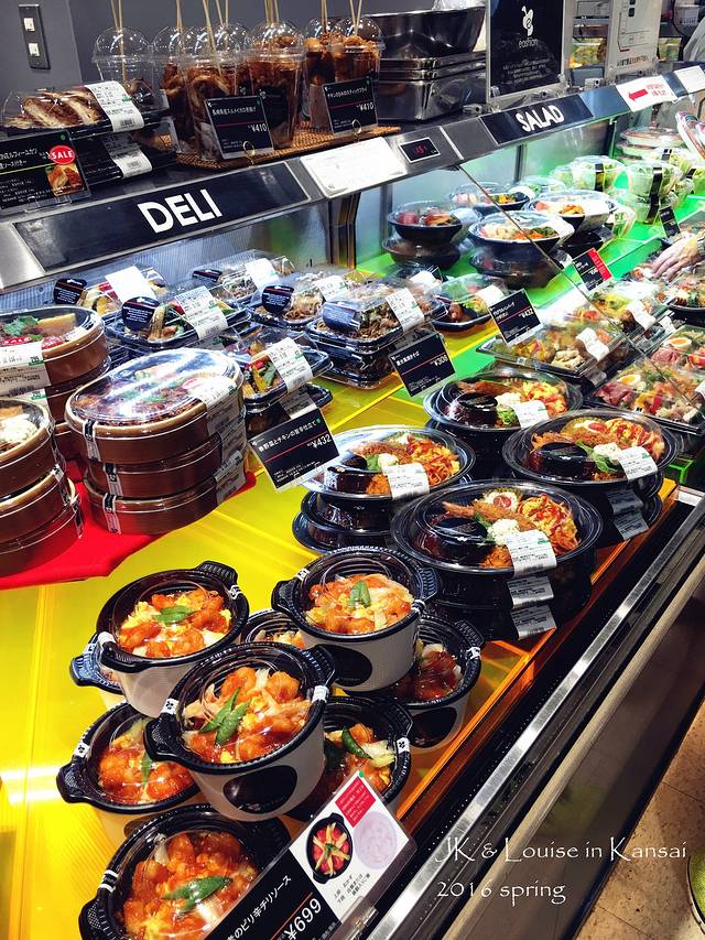 从蓝天大厦下来,我们走回梅田阪急百货楼下的超市,这里晚上八点多就关门了,因此七点多的样子,很多熟食都开始打折促销。正如我之前所说,你要是有什么想吃却找不到的东西,就去日本超市逛逛,你想吃的它都有,看看这些熟食架,每一款都好诱人!