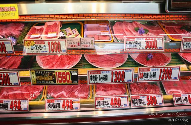 京都的“泓”烤肉一直拥有很高的评价,原本我们中午在京都站打算预约京都站那家“泓”烤肉,但服务员说今天、明天都已经预约满了。火爆到这种程度,想吃的小伙伴请提前3天预约吧!然而,和牛并不是只有在烤肉店才能吃到的,如果你有特别想吃的食材却无法预约到的话,请去日本的超市看看,也许你想吃的都能找到。这家黑毛和牛店是我们在走出哲学之道之后找到的,里面的黑毛和牛新鲜又便宜(比烤肉店吃便宜多了!)。看看这些肉,看看这些纹理,我直接趴在玻璃上流口水了好吗!