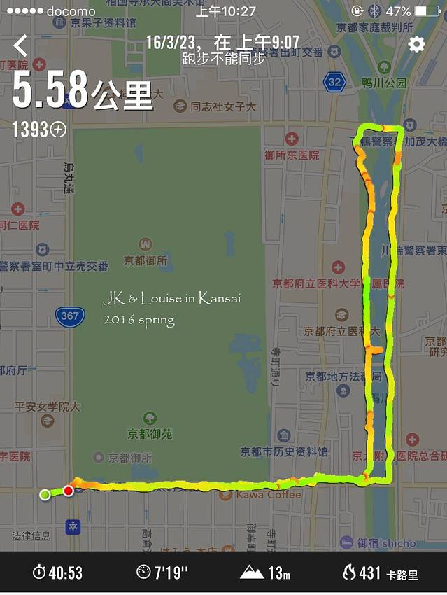自从昨天散步看到鸭川后,就对他念念不忘了,在这样的河岸边跑步可是漫画里经常出现的情景啊。于是这一早我们就决定先去鸭川跑个步。我们住的地方走到鸭川大概也就15分钟的路程,而且离我们最近的那段河刚好是鸭川公园,河岸边种满了两排樱花树。我们一边跑一边惋惜,如若是樱花开放的时候来着跑步,那该是多美好多浪漫的场景啊!