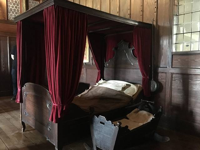 最有趣的地方是城堡领主的卧室,为什么说它有趣呢?因为卧室里的床真的特别迷你特别袖珍,我很疑惑一个成年人怎么躺的下呢?而且更奇怪的是这张床并不是平坦的,上半身部分是半卧的,这就更奇怪了,这样睡肯定不舒服。