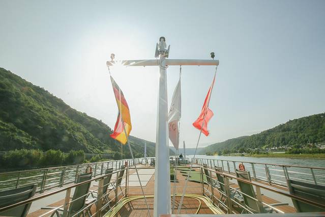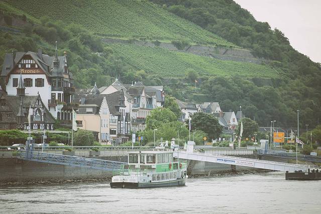莱茵河常常又被称作浪漫莱茵河,流经德国最具魅力的地区。在莱茵河中游,在这段被纳入世界文化遗产的别致流域上迅游,我深深地被两岸葡萄园覆盖的山峦所吸引。今天早上,我们就在游轮的甲板上,一边欣赏沿途风光,一边聆听礼宾的详细解说,让这些富有诗意的风景,显得更加楚楚动人。