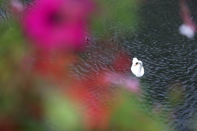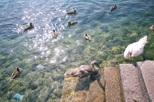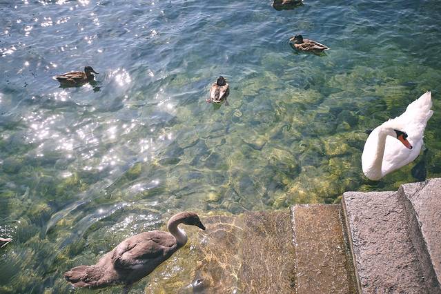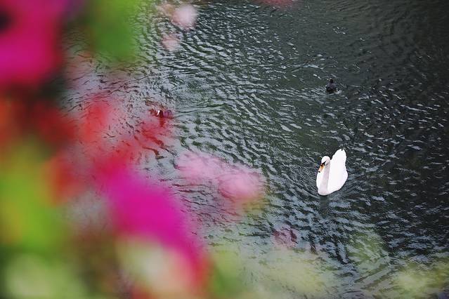 这闪着光芒的水面,犹如钻石般闪耀,天鹅悠闲地在水上游着,时不时与游人互动一下。