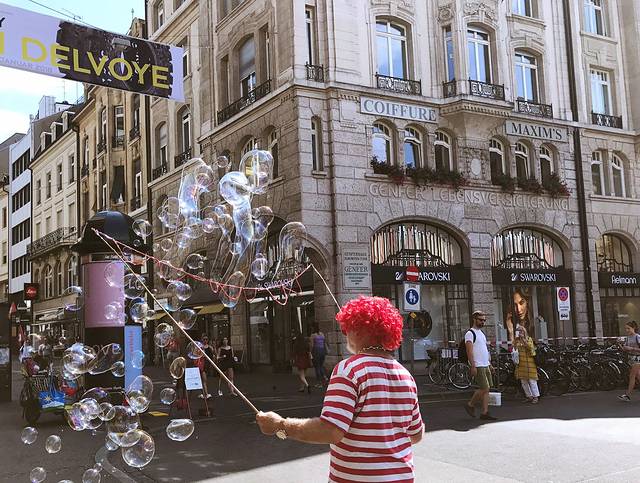 可爱的老爷爷扮成了小丑的模样,在暖暖的阳光下制造出五彩缤纷的泡泡,让我们放下脚步驻足欣赏这充满童趣的小风景。
