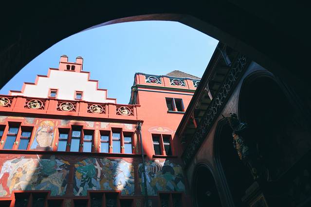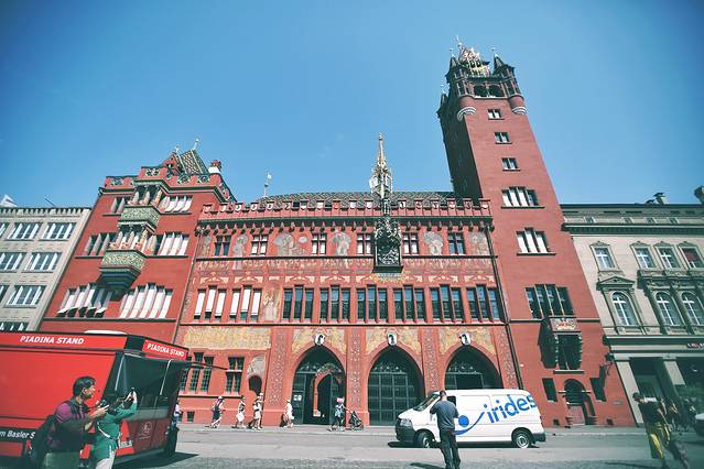 鲜红色的建筑,就是巴塞尔的市政厅了,它是权力的象征。这与众不同的红砂石采集于法国的孚日山脉附近,建筑的样式是新哥特式和文艺复兴式的结合。