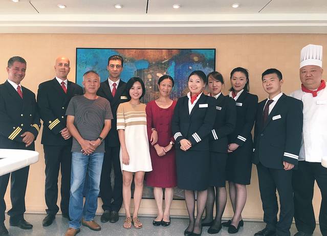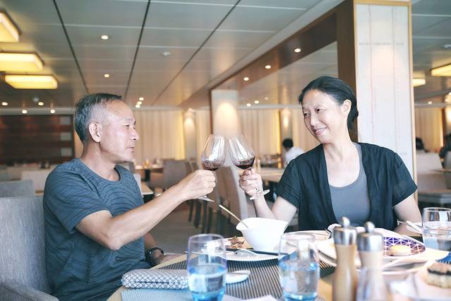 接着是我们在船上的第一顿晚餐,服务人员帮我们倒上了葡萄酒,预祝我们有个美满的行程。