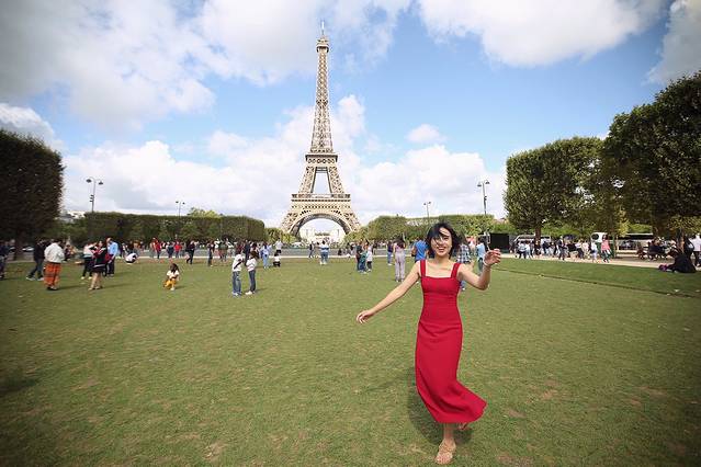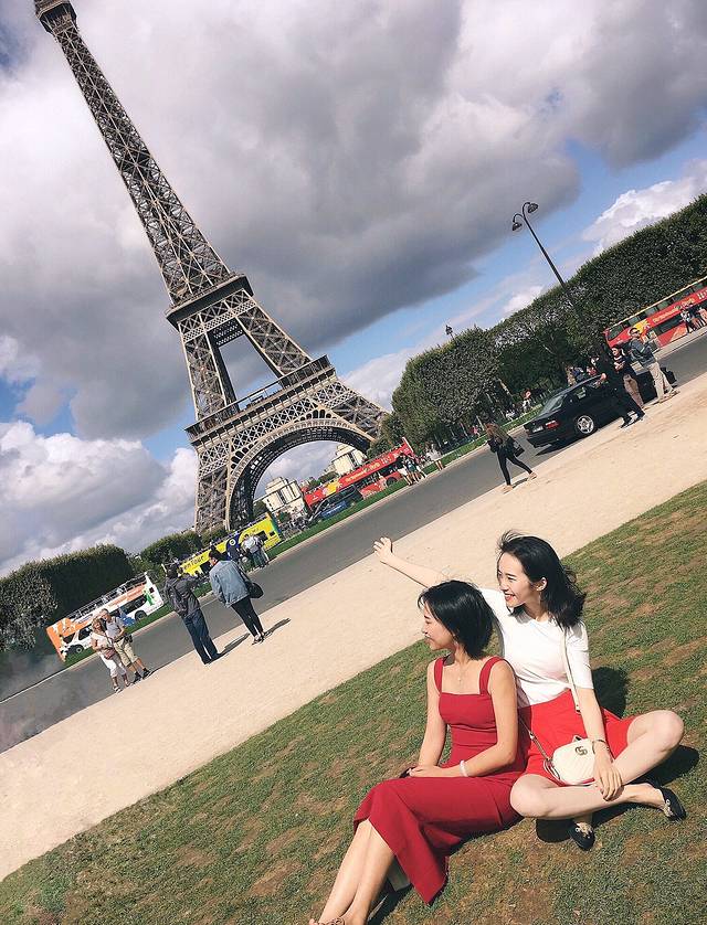 第一次望到铁塔就在你面前,很雄伟,内心按捺不住兴奋,想在每个角落都拍个遍,最后我们选择了一块坐着超多人的草地停下,我也数不清我们按了多少张,这半个小时的停留时间,让人紧张地不知所以,哈哈哈。