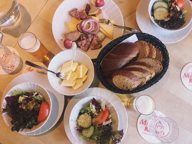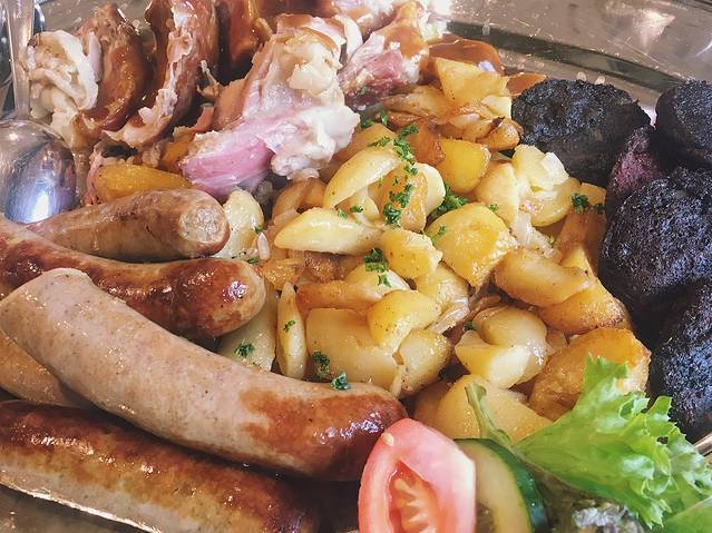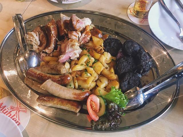一大盆的食物有烤猪蹄、香肠、熏肉和土豆,图里黑黑的是熏肉,专门有清新的苹果酱与其相配,去油解腻。