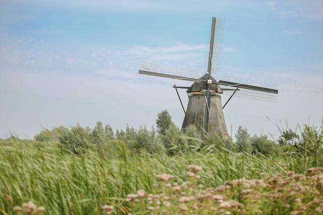 古朴的风车一架架打转着,幸运的是天气正好,要知道在荷兰一年当中几乎只有70多天是晴天,被我们赶上了。芦苇茂盛地被风吹拂,发出沙沙沙的声响。