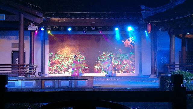 晚上开车再去沈园,去看沈园之夜演出。雨依然不停地在下,还好演出是半开敞式的,隔着舞台和看台之间的淅淅沥沥的缠绵细雨、看着台上凄凄惨惨的千古绝唱,灯影摇曳,人生恍惚。