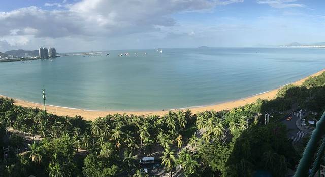 中午退房时间到,我们拉着行李去乘坐公交15路前往三亚湾生意酒店,吉祥街口下车,步行5分钟就到酒店啦,走路当中看着两边的商业街,瞬间觉得从郊外到了省城,O(∩_∩)O哈哈~,好多吃喝玩乐的地方,酒店大门隔一条四车道就是沙滩呀。比亚龙湾酒店还近,比较靠市步行街,想去哪里都很方便呢,住的高级房,没有阳台,但是比较安静,能看见城市的灯火i,小O童鞋跑到对面正在打扫房间居然能看见大海,问前台是180度海景情侣房,所以第三天决定就住这边,最上面的图片就是在房间照的呢!(小贵,但蜜月值得花费),这边都是包含早餐呢,值得推荐哟!!