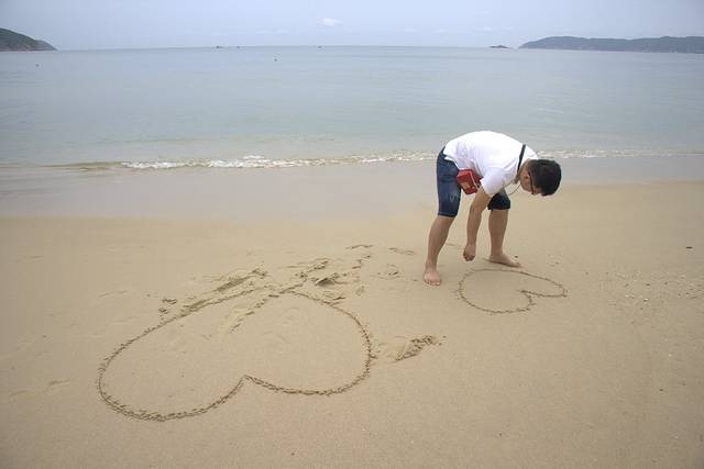 小O童鞋在沙滩画着蹩脚的爱心❥(^_-)