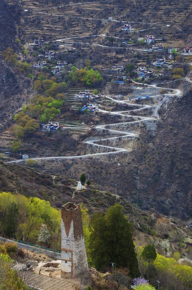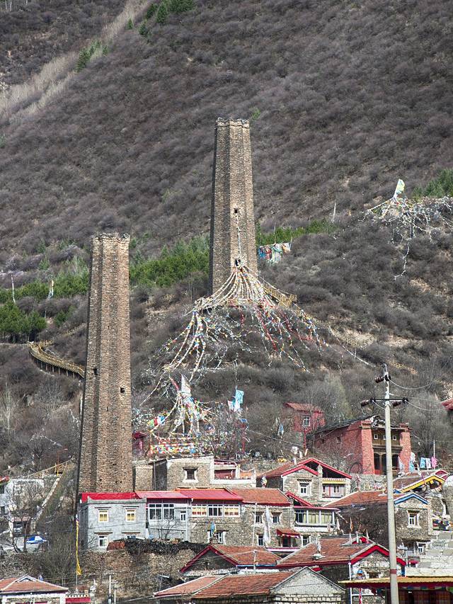 接近马尔康县城的松岗,我们见到这两座被列为全国重点文物保护单位的碉楼。松岗直波碉楼群建于清乾隆年间,为石木结构,整体由下向上渐内收呈台锥形。最有意思的是其中一座高43米高的八角碉楼,半个多世纪来,已经倾斜2.3米,经历3次大地震而屹立不倒,称得上是中国版的“比萨斜塔”。 碉楼相当的雄伟高耸,呈八角形。为什么在这个小村寨会有这么两座雄伟的碉楼,其实历史上直波村也不容小觑,“直波”意为“河水环绕的圣地”,