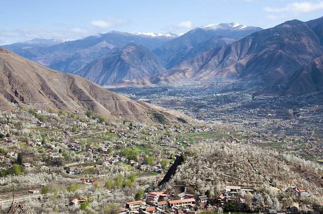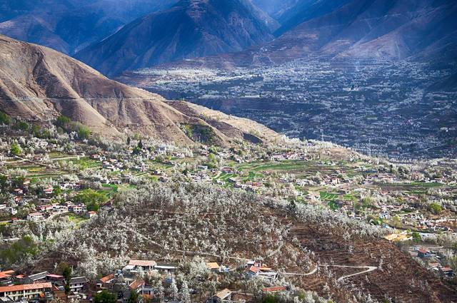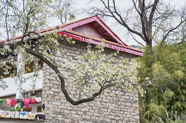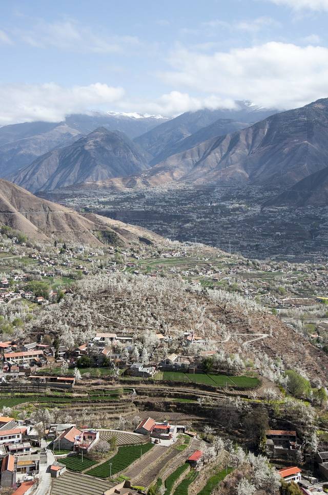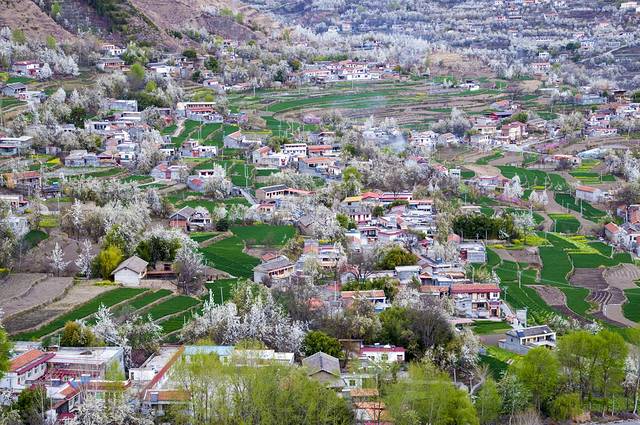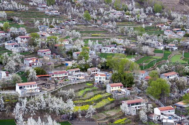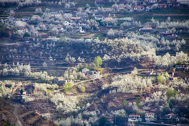 每年春天,满山的各种果树开花和依山而建的白色民居相映在山间。显得格外迷人。