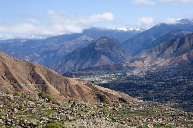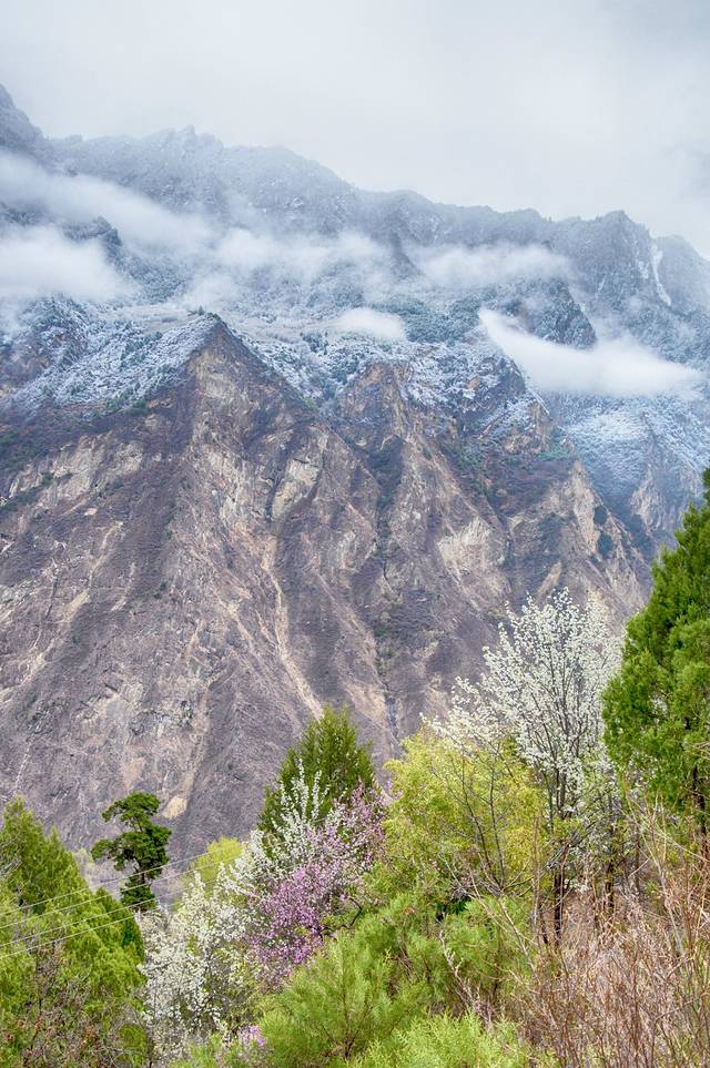 眼前的农舍、前方的梨园、远处直插入云的雪山。在阳光下显露颜色,就像生活在神仙居所,难怪那个开满梨花的小山包被叫作神仙包。