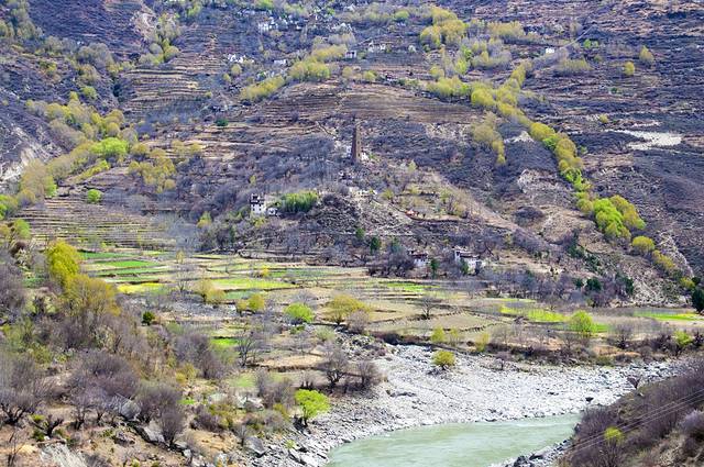大渡河从丹巴到金川一带被称为大金川河,这也是大渡河的正源,河水宽阔平坦,沿河两岸星星点点分布着众多藏族村落。据说,谁家的藏寨房子修得越高,就越有地位,因此有条件的家庭都把房子建在很高的山上。藏房“悬挂”在绿树掩映的悬崖峭壁上,未经规划,却别有一番韵律之美。从甲居藏寨下山之后沿丹巴至金川一线直行,这一带才是更大范围的丹巴藏寨,可谓藏寨摄影创作的天堂。川西高原的天气,说变就变,就在我们驱车前往颇负盛名的梭坡古碉群的时候,天公作美,雨后晴空,艳阳高照。空气清新而又湿润,带着浓郁的春天的味道。