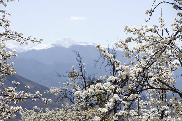 洁白的梨花映衬着巍峨的雪山,一点不比樱花下的富士山逊色。