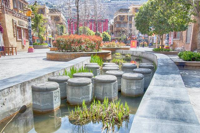 广场的中轴线就是汶川县城的中轴线。周围的建筑是羌族元素,但园林景致却是依照中国传统风水格局来排列。