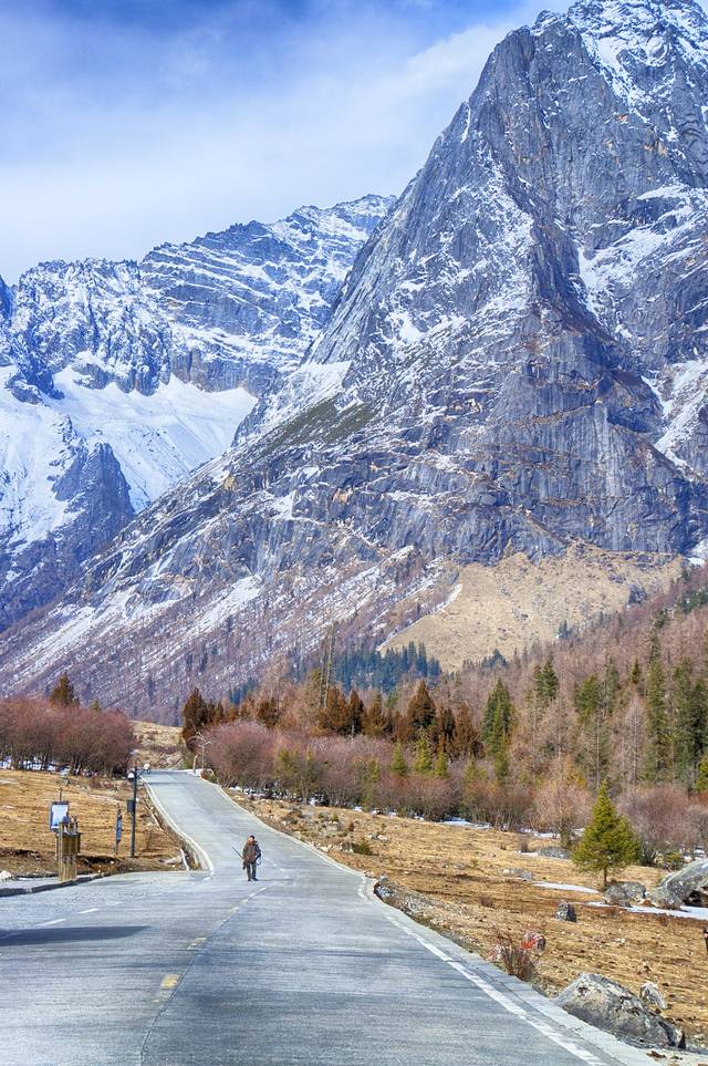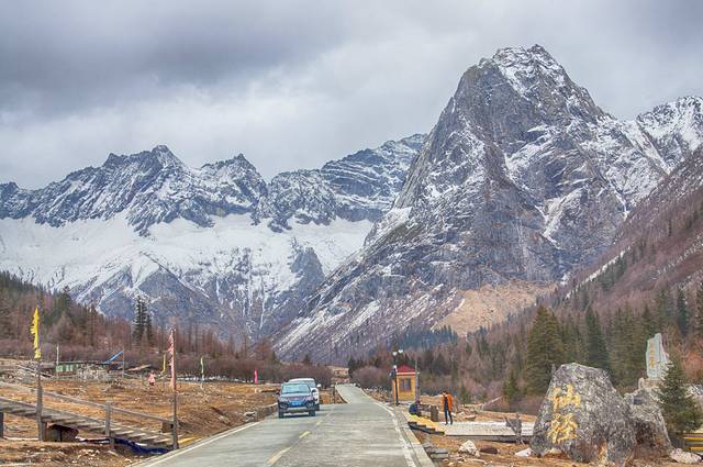 路边守了好久,想拍一张汽车从雪山旁飞弛而过的照片,等了半天却只来了一辆货车。将就点收货吧。这个季节出行的游人的确不多。总比没点动感的雪山照强一点点。