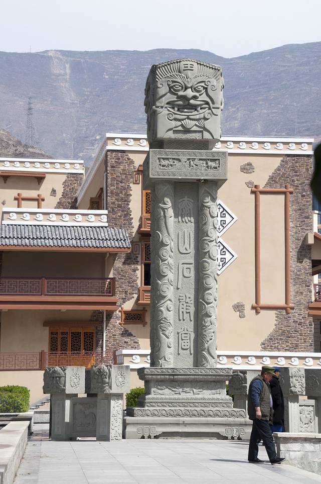 整个广场是震后重建的主要建筑群,位于县城的中轴线上,周边是羌式风格的建筑。这个驱邪挡煞的巨大泰山石敢当耸立在广场的路口,意味深长。