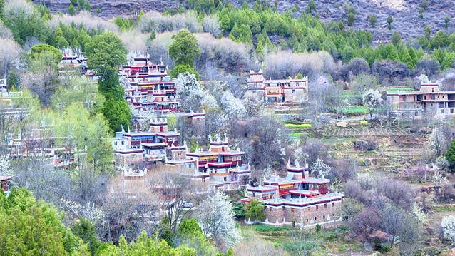 从神仙包上看下面的村落更能清楚地看到这里的建筑形式,这片远离烦嚣的世外梨园,有着迥异于丹巴的另一种美。