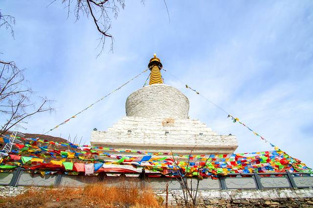 三叉路口建有一座白塔,在藏区,这种白塔随处可见,白塔内放置经文及活佛的舍利子、头发等物。一般重要路口的白塔主要是起震煞作用。