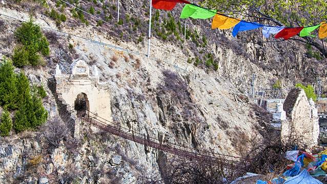 中路藏寨和数年前相比,上山的路已经大为改善,但仍然是条狭窄多弯的山路。这里没有车来车往和络绎不绝的游客,有的,只是墨尔多神山脚下的宁静。这座耸立了千百年的碉楼,依然忠实地守护着这里。