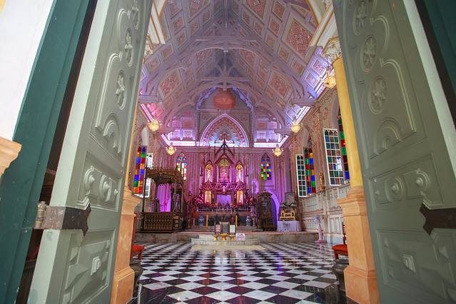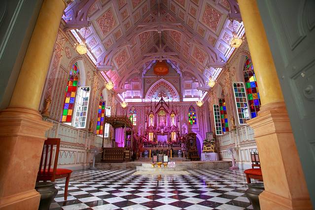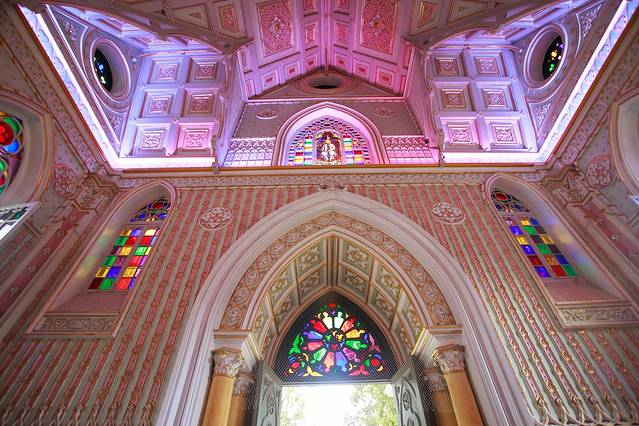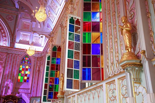 走进教堂,被这五颜六色的内部装饰深深的吸引了。彩色的琉璃玻璃,传统的泰式佛龛,这样的搭配看着却又是和谐的。看多了金灿灿的泰国寺庙,这样的安娜教堂倒显得与众不同。
