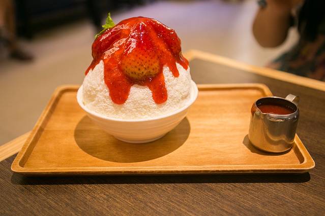 他们的招牌是草莓冰,冰沙很细很软,最里面有蛋糕,最上面淋上了草莓酱,颜值很高。