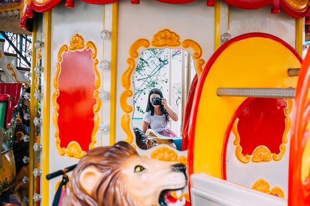 这个大叔超可爱,半个身体身处伸出窗外,外面的游客在拍他,他也在京津有味的拍着他眼中的风景。