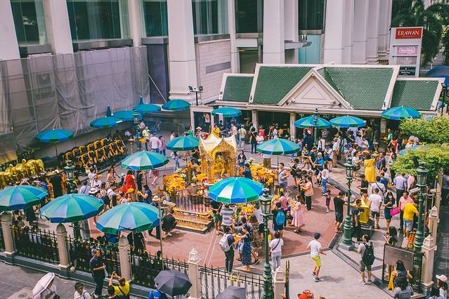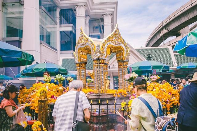 之前四面佛有一起恐怖袭击爆炸,如今四面佛比之前还要金光闪闪,香火依旧旺盛。