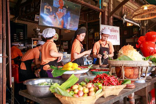 这家店规模很大,食客满堂,看起来味道很棒的样子。木瓜沙拉是泰国的一道特色菜,姑娘们就是在做这道菜。
