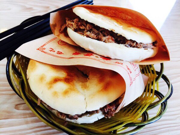 肉夹馍,实际是两种食物的绝妙组合:腊汁肉,白吉馍。肉夹馍合腊汁肉、白吉馍为一体,互为烘托,将各自滋味发挥到极致。馍酥肉香,肥而不腻,回味无穷。腊汁肉历史悠久,闻名中国,配上白吉馍,有着中式汉堡的美誉,扬名中外,深受人们喜爱。腊汁肉夹馍由三十多种调料精心配制而成,由于选料精细,火功到家,加上使用陈年老汤,因此所制的腊汁肉与众不同,具有色泽红润,气味芬芳,肉质软糯,糜而不烂,浓郁醇香的独特风味。