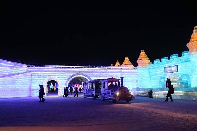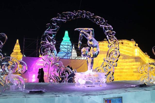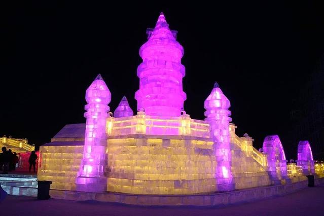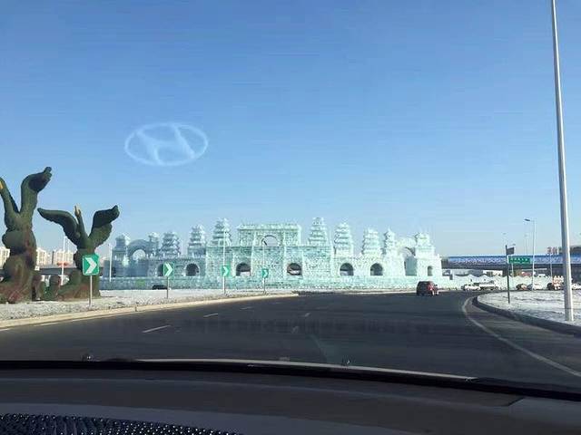下飞机后被去哪儿的接送机放了鸽子 于是我们自己打了滴滴 发现去哪儿接送机比滴滴贵很多 打车还是滴滴吧 东北的滴滴司机们都很健谈 经常被一口流利的东北话逗乐 路上看到的第一个冰雕 晚上亮灯后真的很好看。