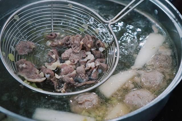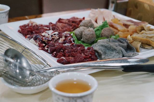 以前看书里写,福合埕牛肉店里的牛肉每天新鲜宰杀,一小时内送到店里,牛肉鲜得还会动。有的部位的肉非常少,去得早才或许有机会吃到。一片牛肉入锅只要六秒钟即可食用,为了还原食材本来的味道,用清水牛肉汤作为锅底,不加任何佐料。