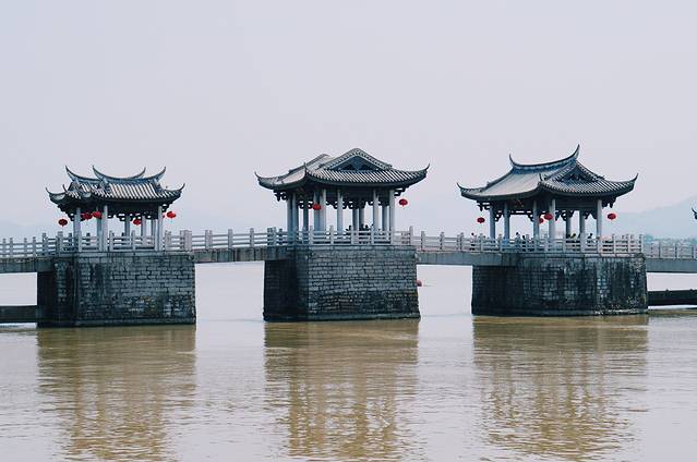 我们去的第一个景点是潮州广济桥。它的名气,在于它的身份——中国四大古桥之一 (另外三个是赵州桥、洛阳桥和卢沟桥);它的独特之处在于结构——中国第一座启闭式浮桥,通俗点说,就是可开可合,开启时可通航可泄洪。但我们最终并没有走近它,因为……门票太贵了,居然要50块。对于我们这种从清晨吃到傍晚两个人也总共吃了120块钱的人来说,一下子花掉100块实在奢侈。于是我们决定舍弃这座有名的桥梁,走马观花欣赏一下与桥梁链接的古城墙和广济门城楼。