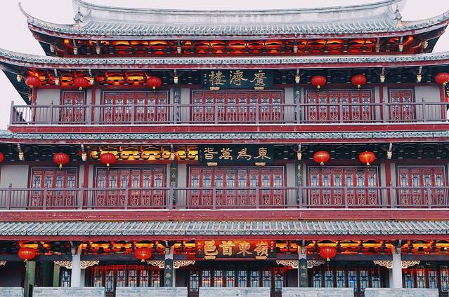广济门城楼以古城墙为台基,稳固且壮观,早就听说广济桥的夜景很美,而我们去的时候刚好太阳开始落山,白天黯淡无光的玻璃瓦和红色墙壁在黄昏中因为夕阳和灯光的映衬,开始渐渐营造出“雕栏玉砌、琼楼玉宇”的氛围,在整座老城中格外耀眼。