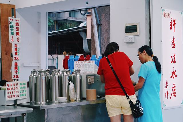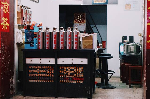 除了食物,在潮汕,确切的说在整个岭南地区,凉茶也是生活的重要组成部分,面积只有一间屋子大小的凉茶铺遍地都是,当地人管这叫凉水店,装修通常十分简单,店门前摆着一排保温壶,上面帖着各种凉水的名称,如蛇舌草、山葡萄、板蓝根之类,价格便宜,几块钱一碗,旁边放着免费给客人品尝的陈皮。即便是交通再拥挤,心情再焦灼,经过这些街边的凉茶铺子,心中燥火就会神奇的降温。以前看中医,中医大夫说我是湿热体质,跟潮汕气候相符,饮凉茶正好。