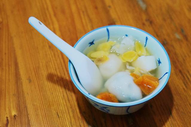 鸭母捻是一道类似汤圆的甜品,但比汤圆花样更多,每一颗丸子味道都不一样,有两颗汤圆格外大,分别包裹了红豆沙和绿豆沙,丸子形状也不规则,除此之外碗里还有鹌鹑蛋、银耳、莲子、百合、白果、绿豆等,对于我俩这种喜欢清甜口味的粤菜死忠粉,鸭母捻的确很对味。我甚至没来得及仔细拍张照片,一碗鸭母捻就真的只剩碗了……