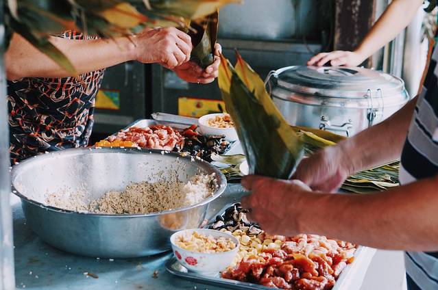 ▲潮州人管粽子叫粽球,甜咸口味都有,咸粽子内馅有香菇、虾米、灌肠、咸蛋黄、莲子、猪肉等,甜的有甜糯米、乌豆沙、白果、瓜丁等,也有两种口味的“双拼粽球”。作为吃惯了甜粽子的北方人,的确有点吃不惯肉馅的咸粽子。