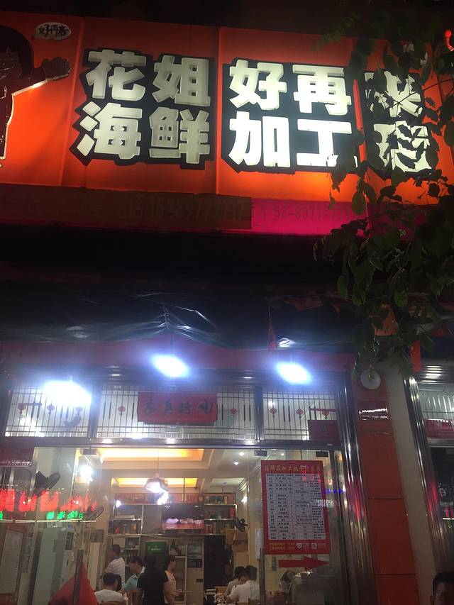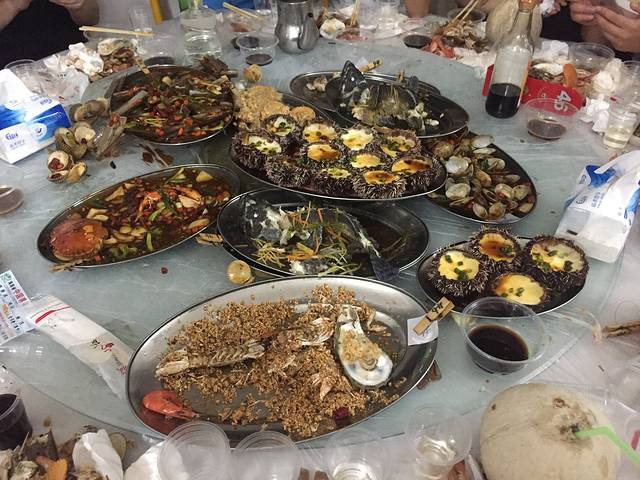 海棠湾这边还蛮荒的,吃东西的地方少,而且公交车好像9点就收,收了车打车回去得一百多。才出了大血,还是饿着肚子回大东海找吃的,在美团上面看排行榜,去了花姐加工店,5个人点的598六人餐,很不错,分量品种足,味道也很不错,比头两天吃的更接近四川口味。
