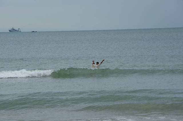 第一次在海里面游泳,有点兴奋过头,一个浪过来喝了一口,那味道真的不摆了。而且海水进鼻子、耳朵或者眼睛滋味都不好受,所以刚开始最好还是悠着点。游泳要去围了的地方,安全才是最重要的,海浪的力量比想象中大得多,要带你走再怎么挣扎都没用。