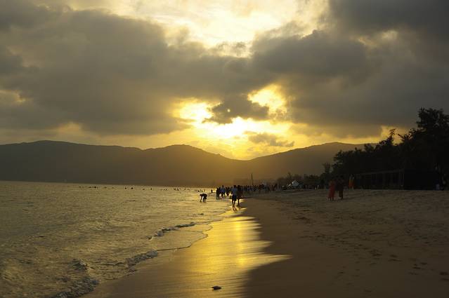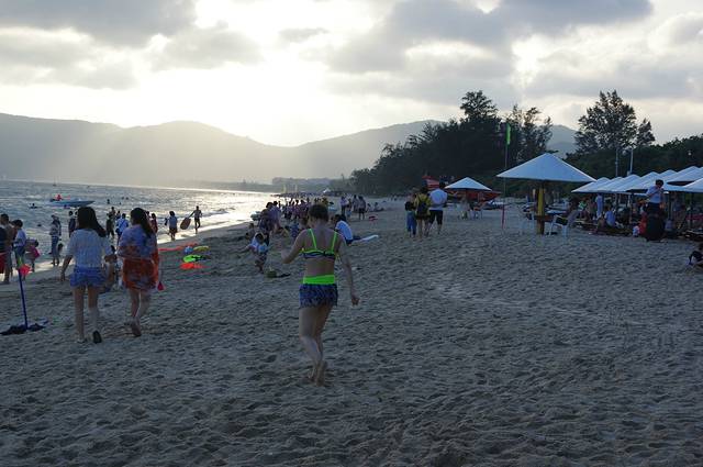 海边很好玩儿,没多久就天黑了,在亚龙湾看了日落,很漂亮。浴场5点左右就会清场,所以要游泳不能太晚去,当然水性好就无所谓了,你在任何时候都可以去游,不要去浴场就是了。其实游泳就是要挑这种多云的天气去,不然海边大太阳真的太晒人了。
