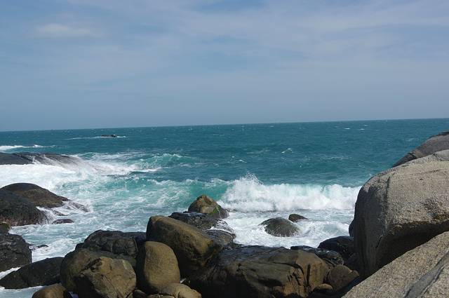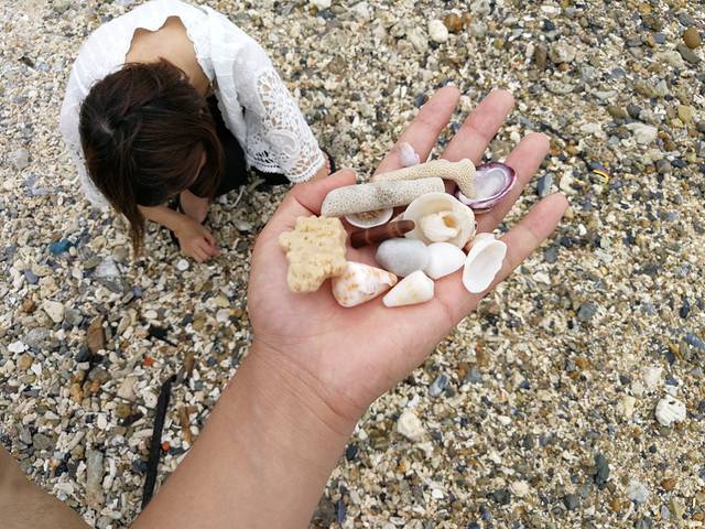大东海有部分是这种石头滩,里面可以有很多贝壳和珊瑚石,捡贝壳一定要注意海浪,你不知道哪个海浪会很大,像这个地方有时候一个大浪带着点石头打腿上是真的疼,像下面这样。