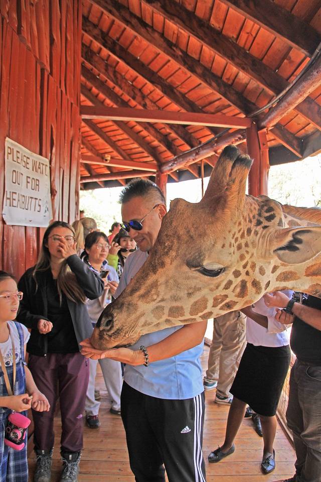 在这个公园,游客可以和长颈鹿亲密接触,也可以用公园提供的食物亲自喂食。当长颈鹿像砂纸一样蓝灰色的舌头,舔舐你手中的食物时,心中有一种莫名的快感。