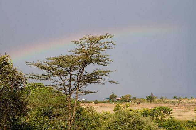 马赛马拉国家野生动物保护区。刚刚下过一阵雨,半道彩虹挂在天边。